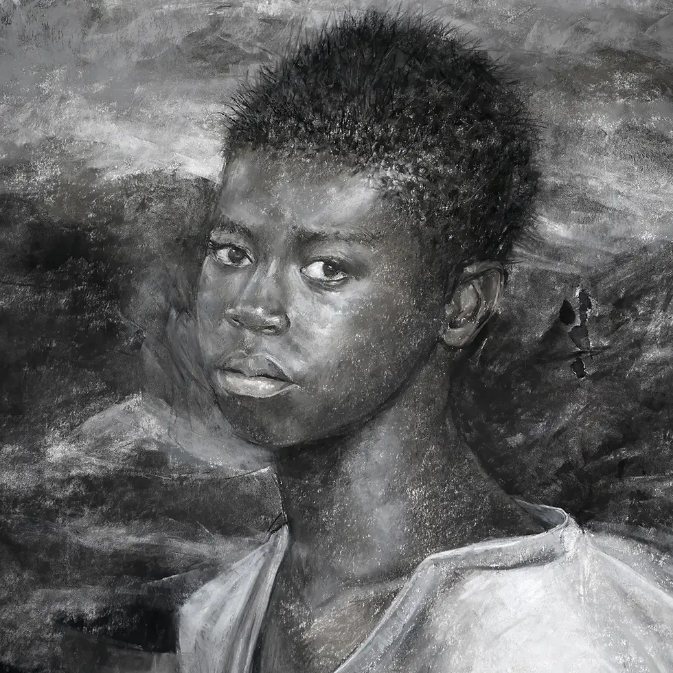 Discover haunting contemporary charcoal portrait and climate disaster art.