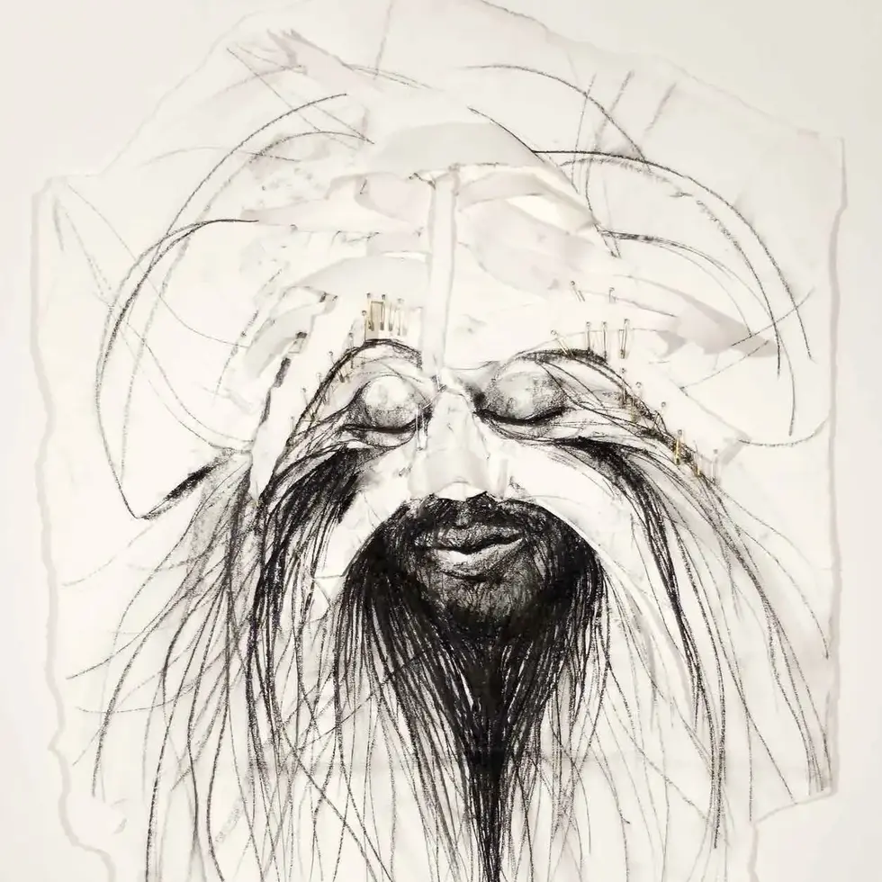 Original Torn Paper and Charcoal Collage With Safety Pins: 32"x28"